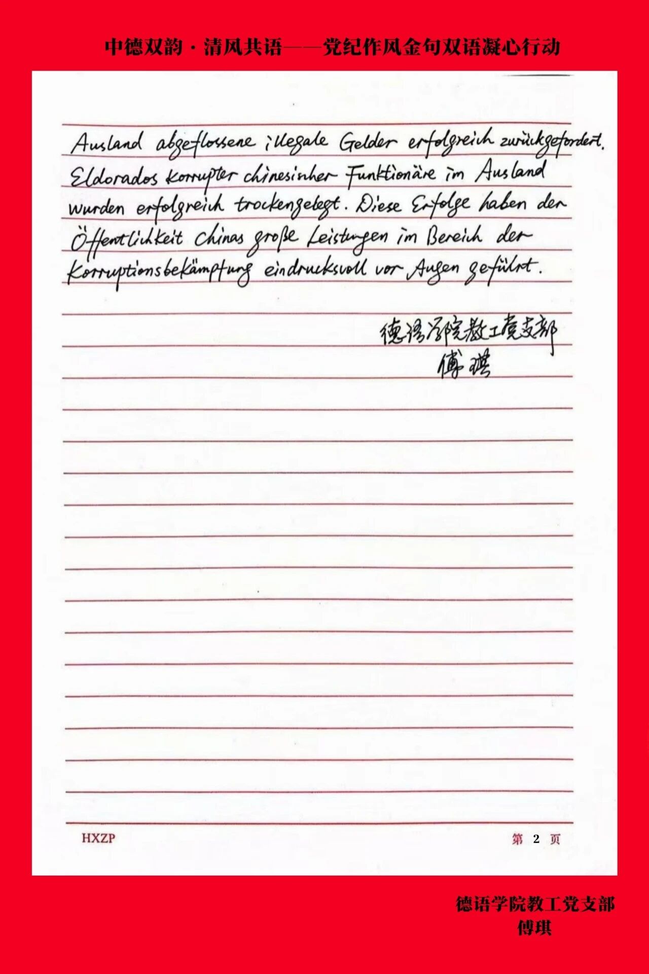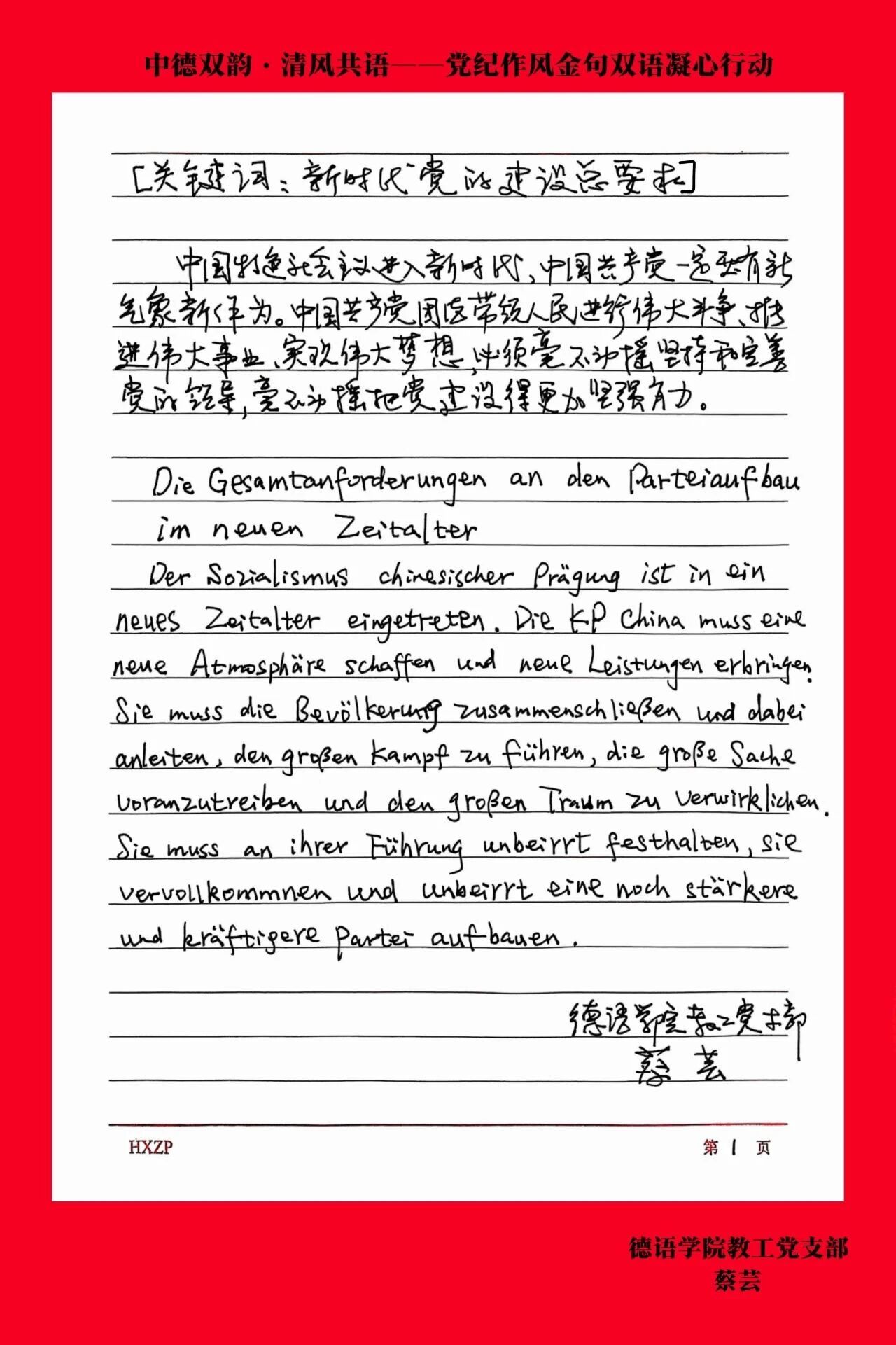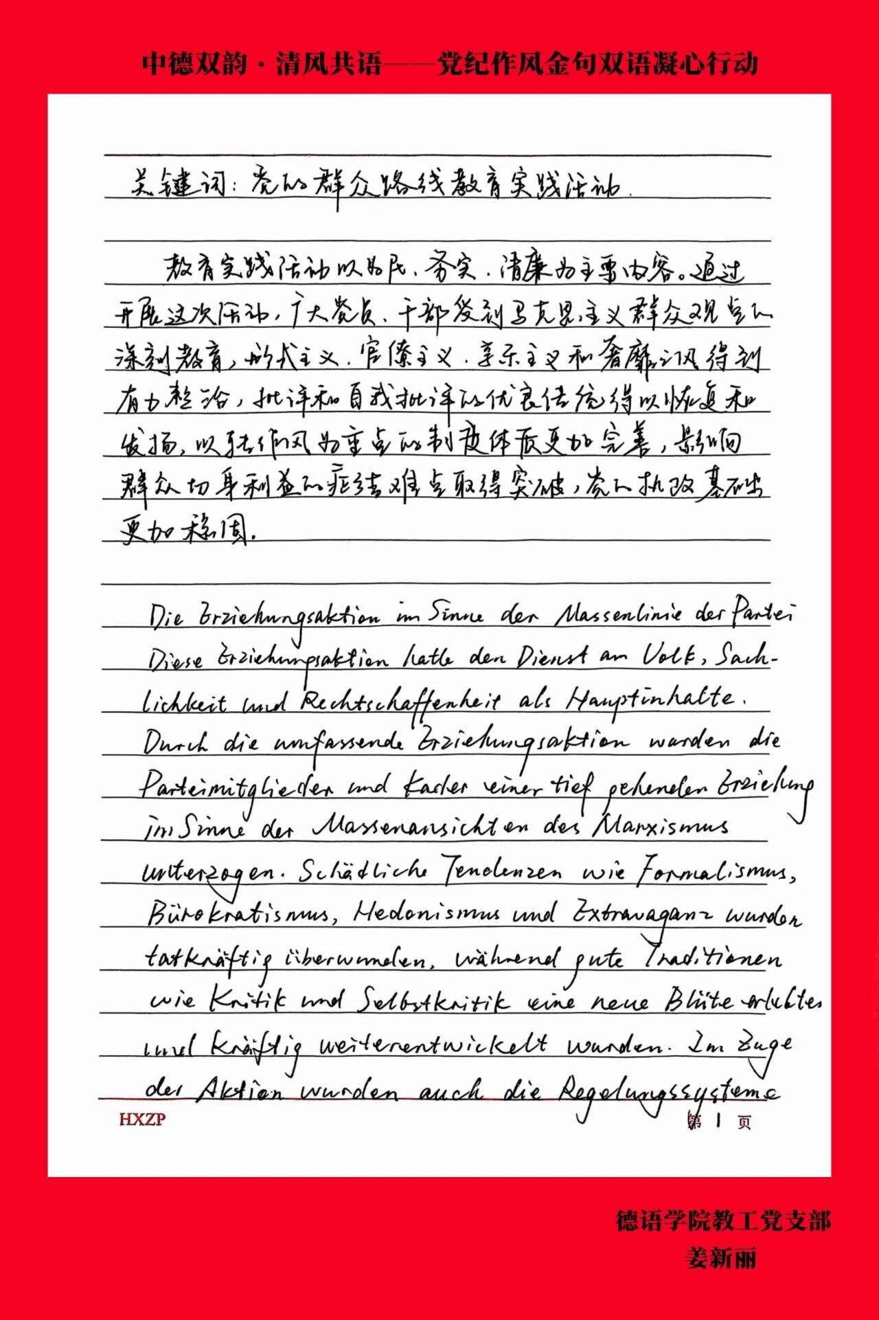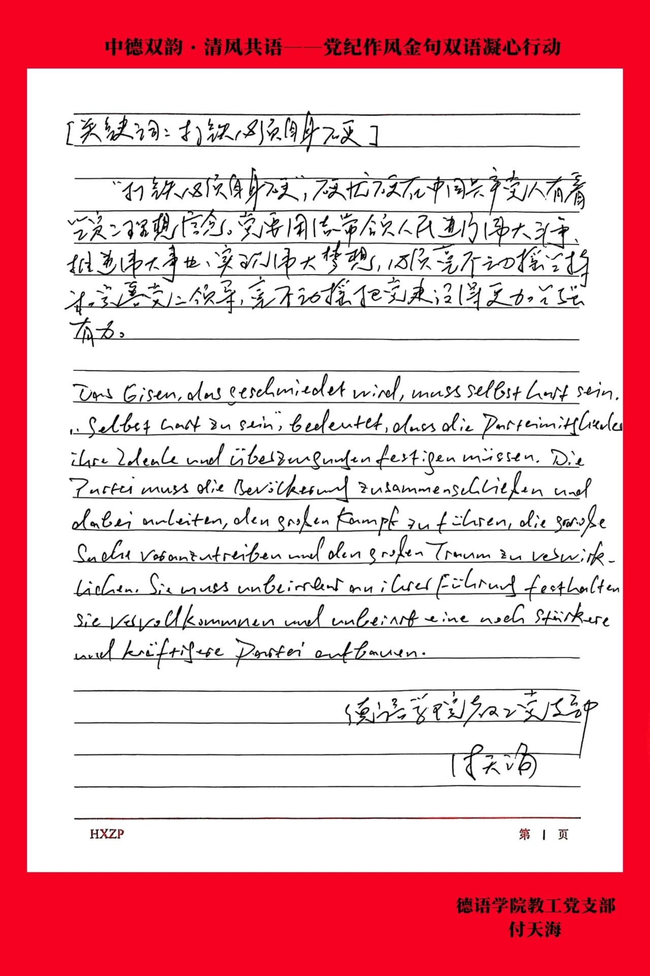 为深入贯彻中央八项规定精神学习教育,弘扬清风正气,德语学院教工党支部于6月25日下午开展了“中德双韵·清风共语——党纪作风金句双语凝心行动”。全体教工党员以笔为媒,用双语为载体精心撰写党纪作风金句。这些金句,是党员们对党纪的深刻领悟,是对优良作风的坚定传承。每一句都凝聚着智慧与信念,彰显着责任与担当。现在,让我们走进这些金句,共同体悟其中蕴含的深邃的政治智慧与坚定的理想信念,共同感受教工党员们严守党纪、弘扬作风的使命担当。