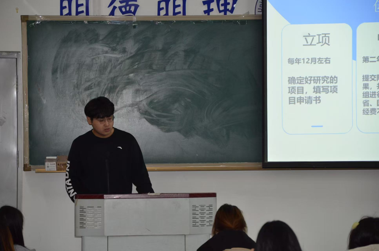 为了为助力同学们全面、深入地了解大学生创新创业大赛,11月20日18时30分,由德语学院创新创业部主办,以“惟实创新迎激浪,精进臻善稳驭舟”为主题的大创经验分享会于励志楼B区521教室举行。本次分享会邀请到大创项目负责人宋子烨、邓紫炫两位同学进行分享。